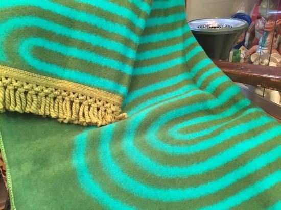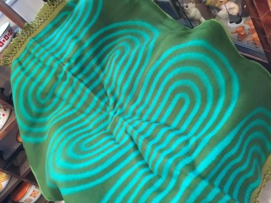 グリーンの毛布にブルーの曲線ラインがミッドセンチュリーな雰囲気です。