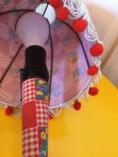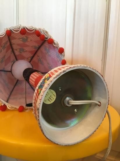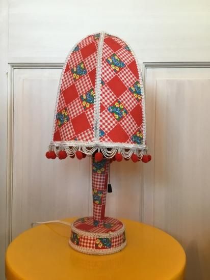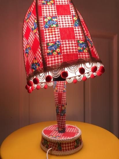 赤い布製シェードに白いフリンジ付きテーブルランプ/デスクライトです。