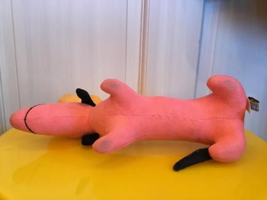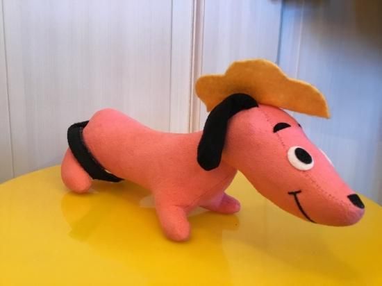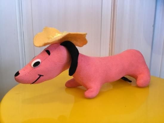 ピンクのダックスフント。おしゃれな帽子を被っています。復刻版でも人気があります。