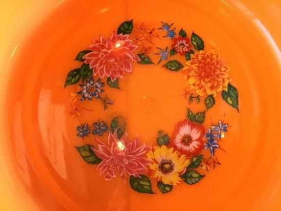 レトロポップなオレンジ色の花柄のたらいです。
