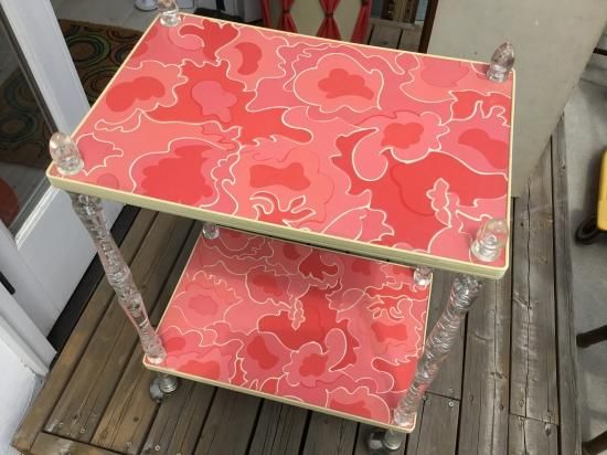 ピンクと赤の模様が可愛らしいキッチンワゴン