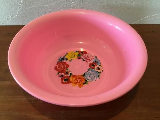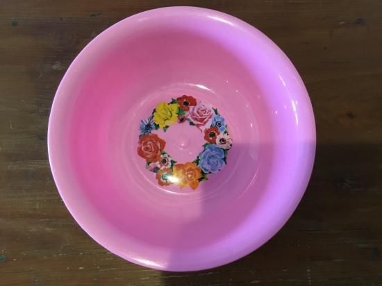 薔薇やポピーのプリントが美しいピンクの洗面器です。