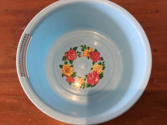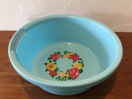 花柄プラスチック桶 / たらい/ 洗面器 水色 バラ柄網目あり