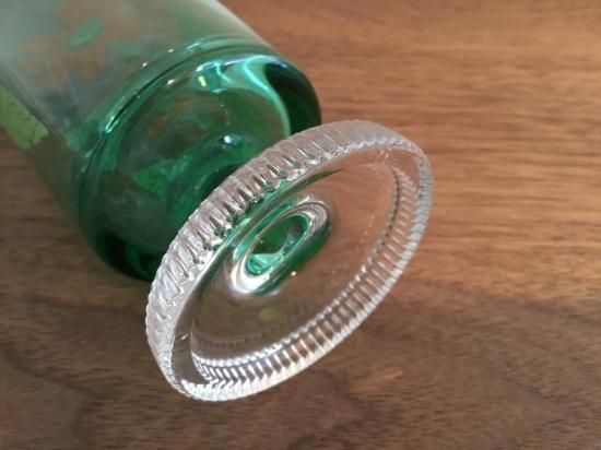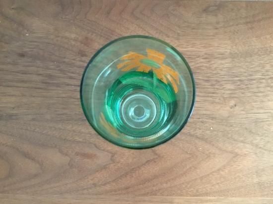グリーンのガラスに貼り絵のような珍しい柄です。